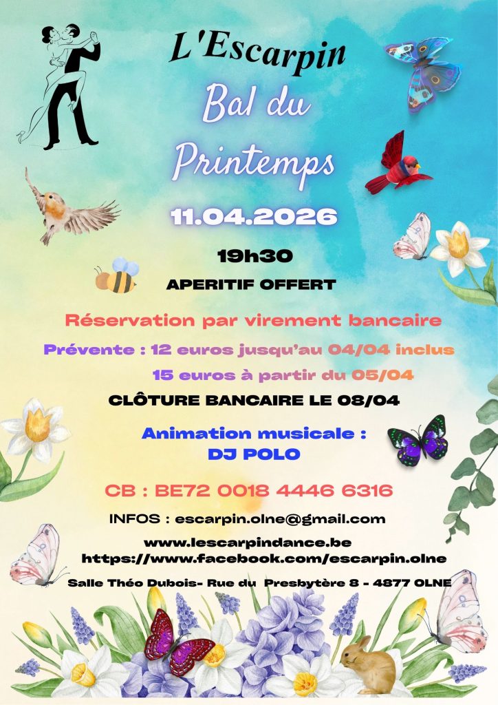 Evènements Compte bancaire : BE72 0018 4446 6316 Plus d’infos : escarpin.olne@gmail.com http://lescarpindanse.be et sur Facebook https://www.facebook.com/escarpin.olne